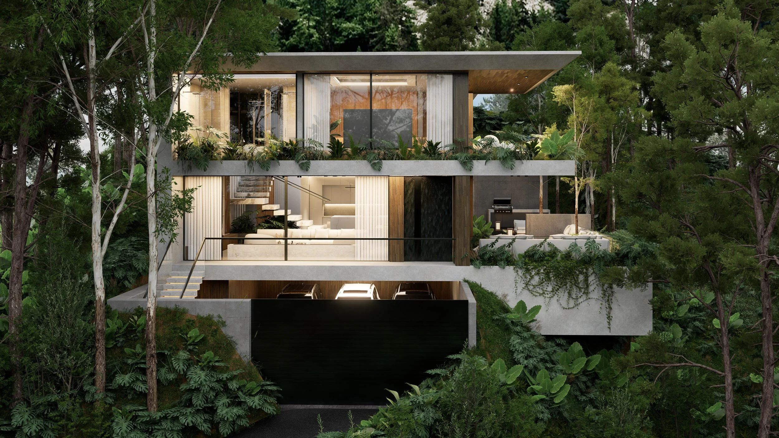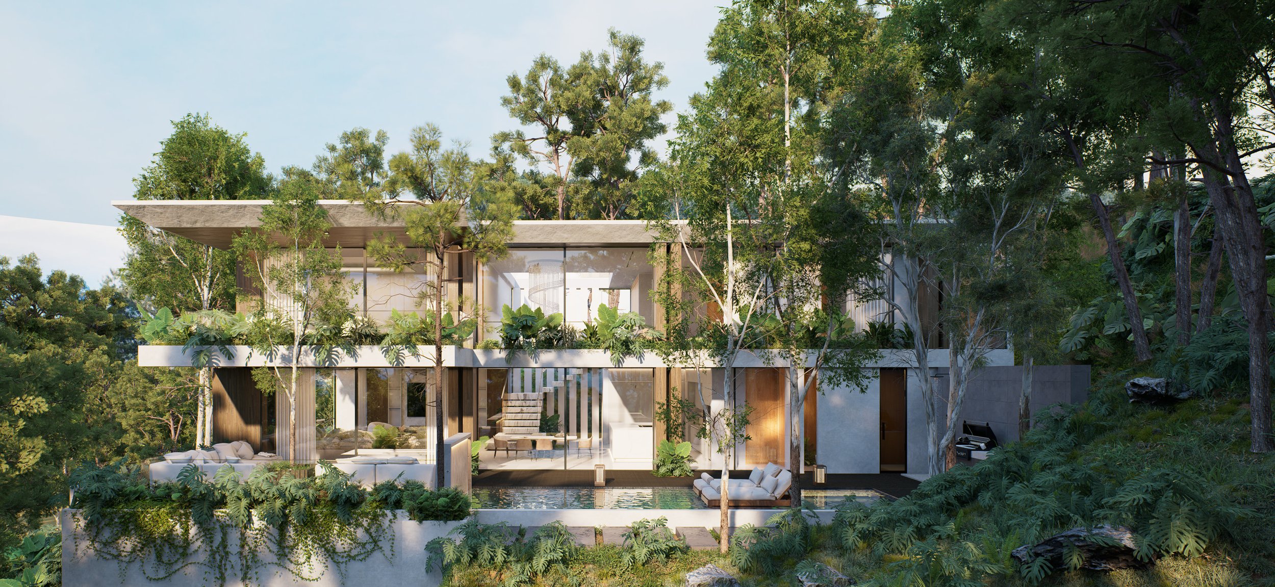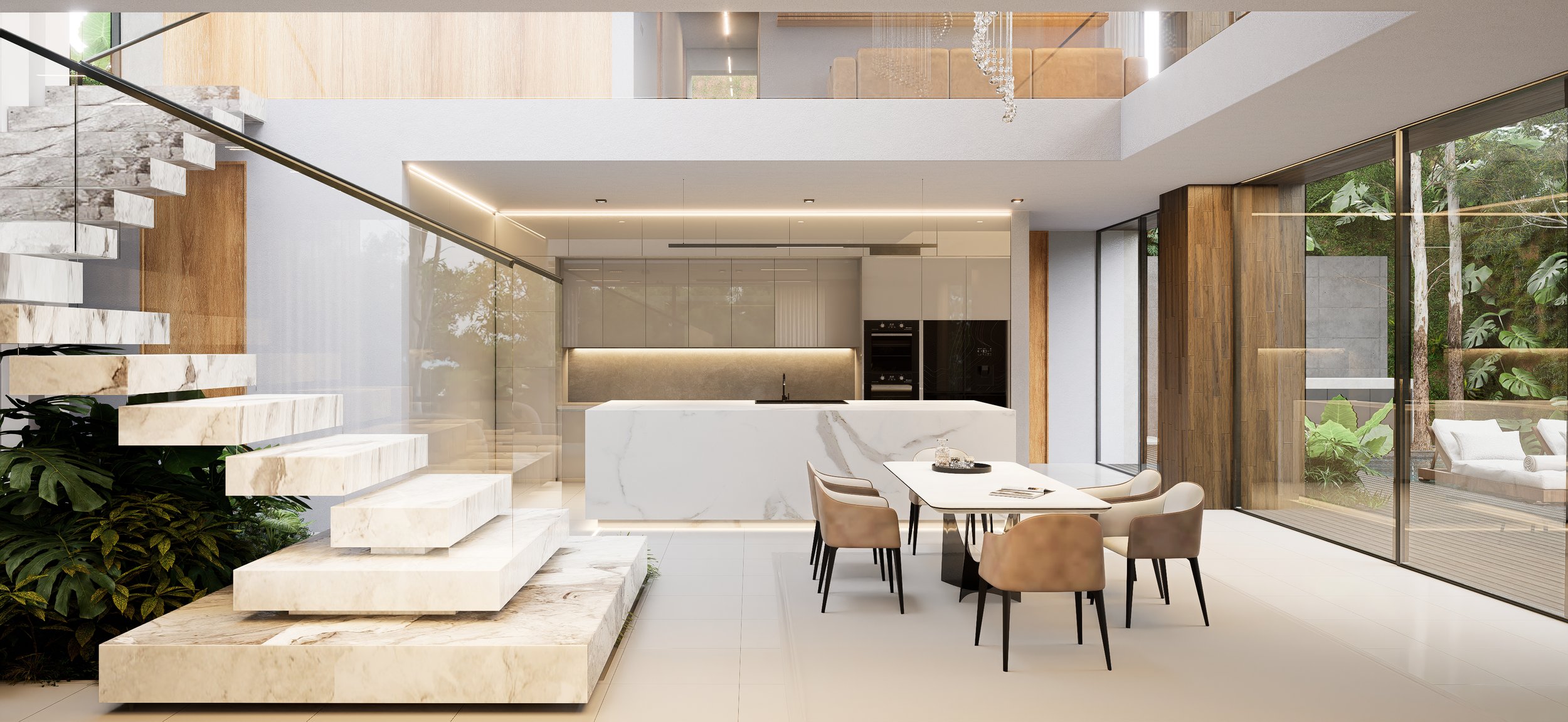 Natural lighting accentuates the architectural structure, while open spaces promote a fluid integration between the interior and exterior.